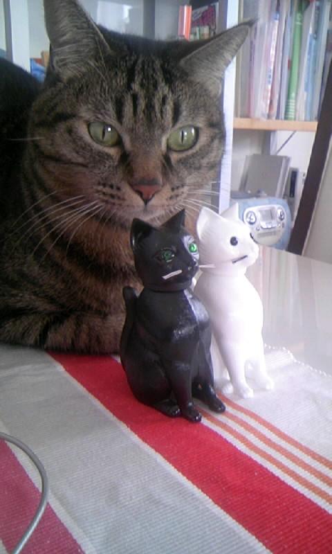 ちょっと寂しげ?な先住猫さまと、先週雑貨屋で見つけた猫さまの置物です☆