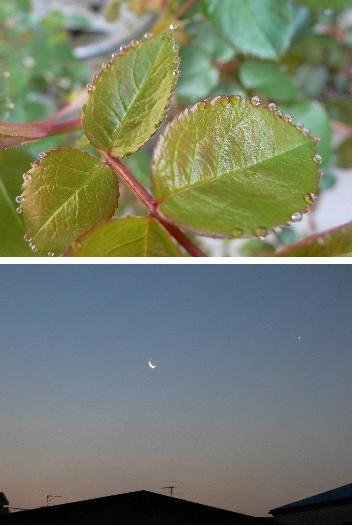 ネックレスの様に葉の周りに水玉が・・・。 そして夜明けの月。