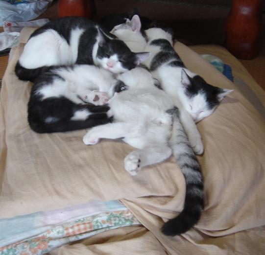 猫ちゃんたちはやけにかたまって私の布団の上!