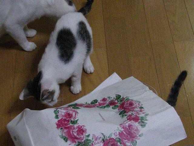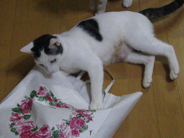 この紙カバンは、3日経った今も、猫のおもちゃとしてリビングに転がっています。