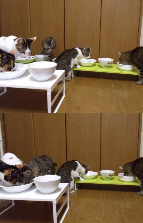 以前は、プラスティック容器を使っていたんだけど、浅いこともあって、下に散らばったり、運動会をして水や餌をひっくり返してグチャグチャにされてたから、テーブルを置いて(オフィス用品)食器は私達が使っていた、スープ皿、グラタン皿、どんぶり、カレー皿を猫用にしました。