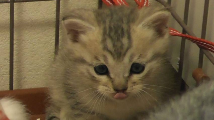 サバトラと淡いクリームの混じったような可愛い子猫です。