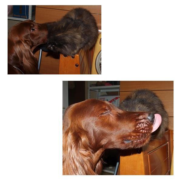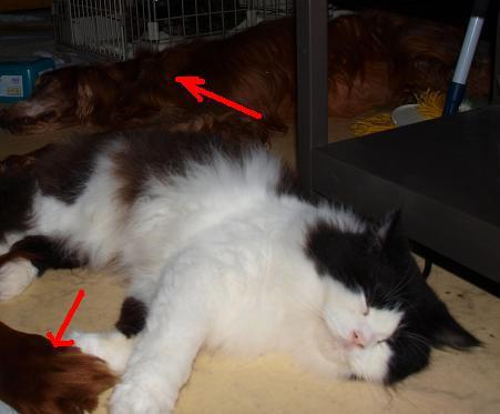 下の足は舐め犬の足・・・大きなワンコの間に猫が寝ます