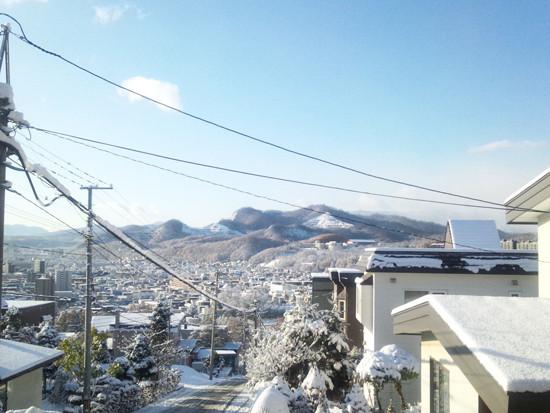 歩道は、降り積もった雪と落ち葉に敷き詰められ、コントラストが美しい。