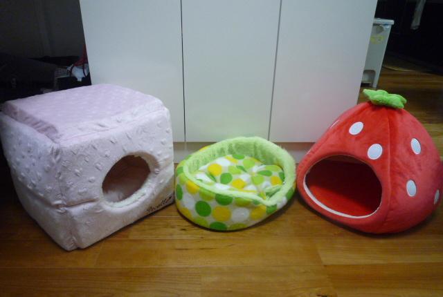 きなこに用意したニャンコハウスは3つ、1つは保護主さんに譲っていただいたオープンタイプ、後二つはこちらで準備した屋根つきのイチゴドームとピンクのボックスタイプ。