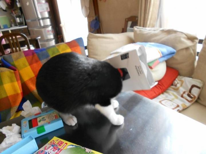 テイッシュボックスに頭をつっこんで取れなくなりました。(汗)