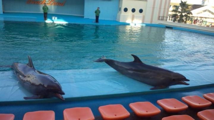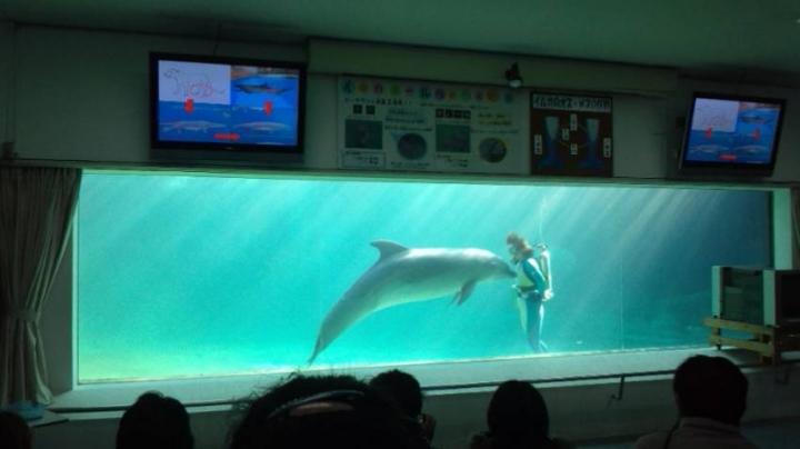 その後は、イルカの生態を実際のイルカを使って説明しているシアターに
