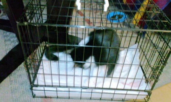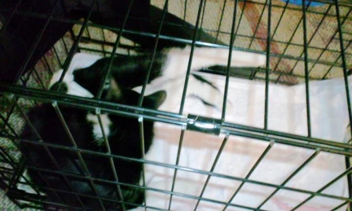 経過は今の所良好ですが、動物病院の院長さんに「活発な猫だから、抜糸するまではケージに入れておいて下さい」とのことなのでご覧のとおりです