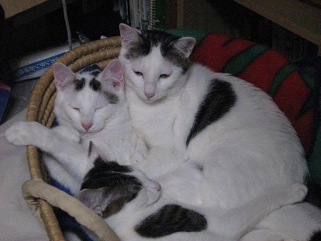 猫ベッドにしてあるベビークーハンで、寄り添って眠る3匹。