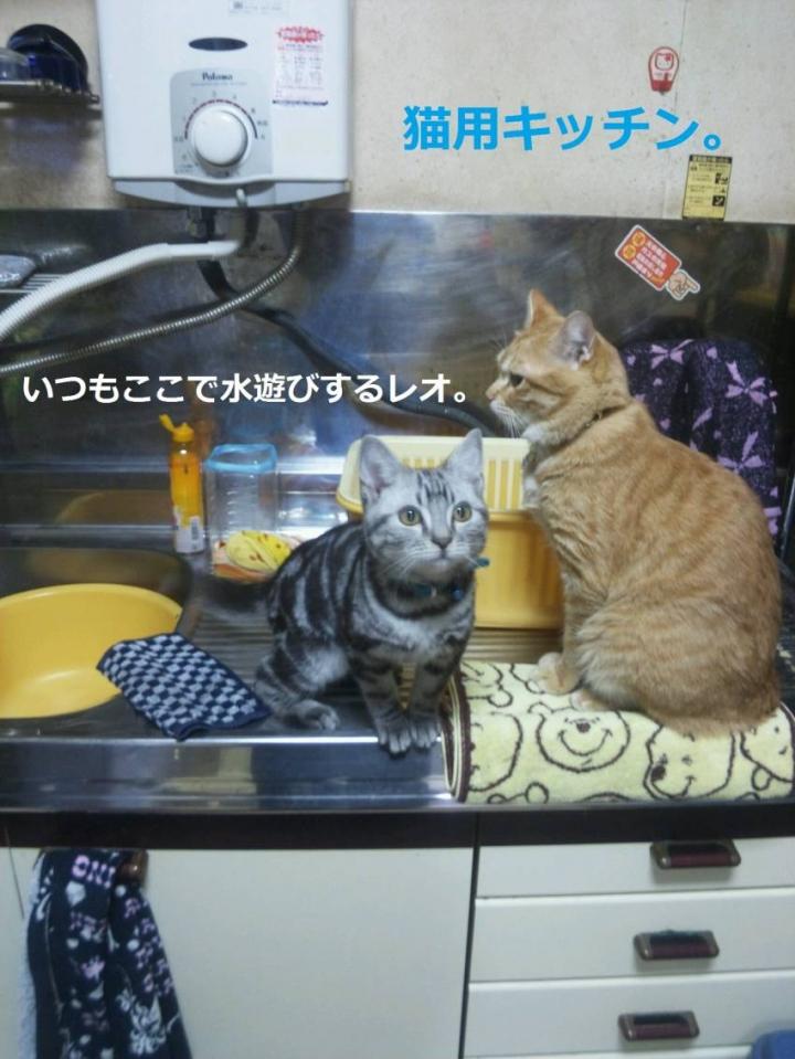 二匹で猫用キッチンにのぼり、レオは水遊び、ちゃおは眺めていました。
