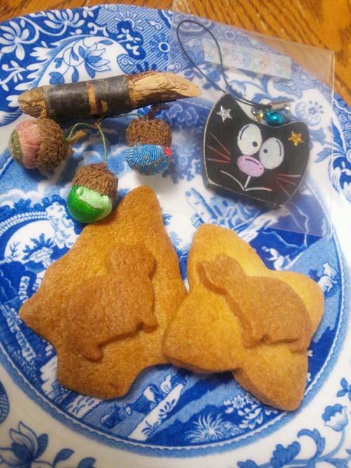 ミューズさんお手製クッキーとチャリティグッズ(左:ブローチ、右ストラップ)