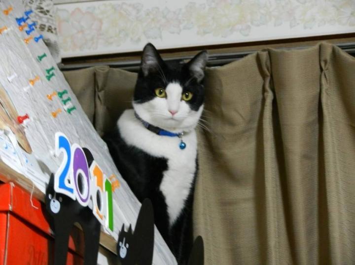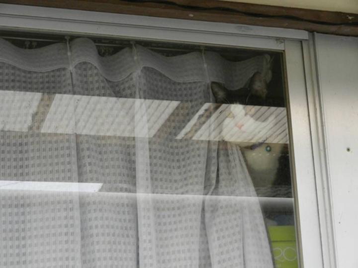 管理人室のキャビネットの上に上がり、カーテンを押しのけ顔を出す。