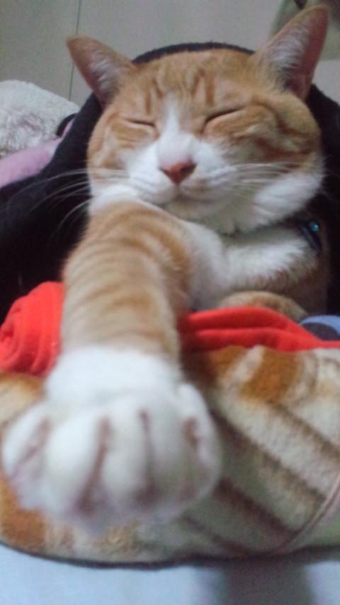 写真は寝起きのグゥです。起きて前足を伸ばして、そのまま寝てしまいました。