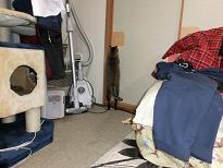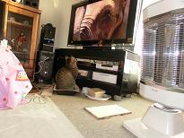 手が届かないのがわかると、あわててテレビの後ろへ行くんだ。