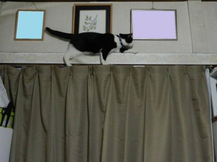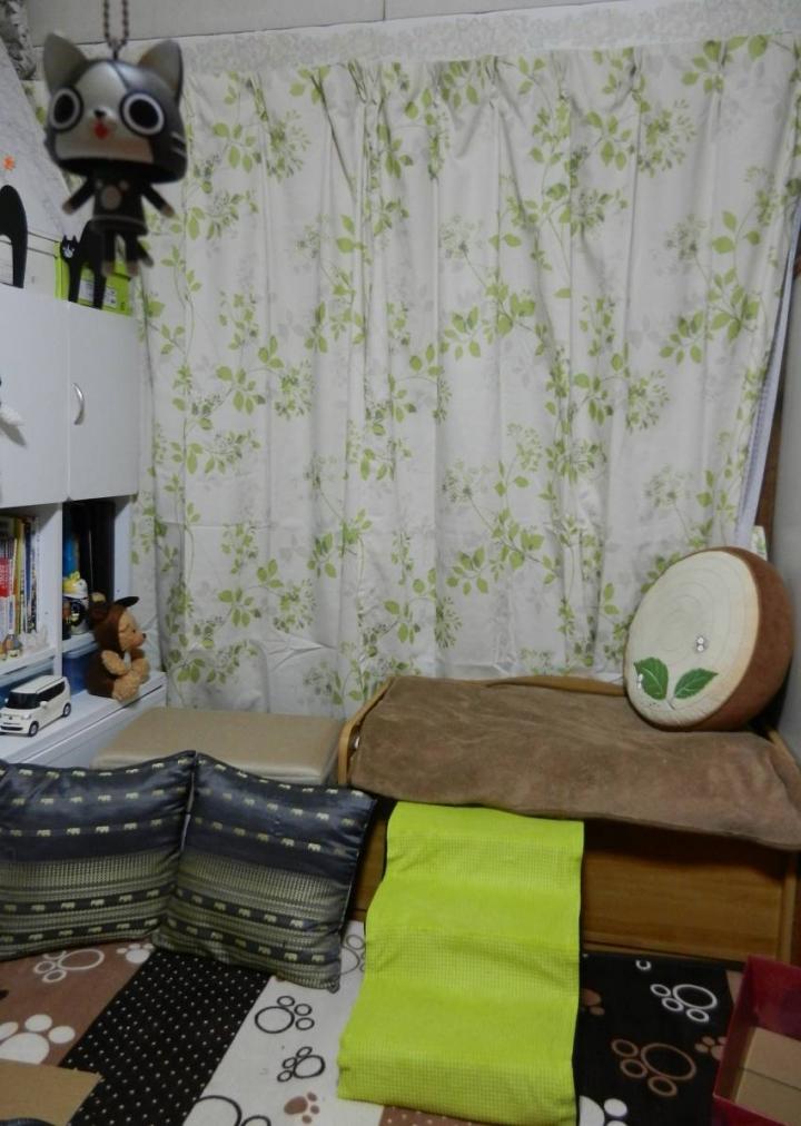 私は、2ニャンが付けた引っ張り跡のついた緑のカーテンを処分した。
