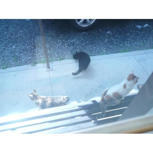庭に集う外にゃん達 黒の母にゃんと去年生まれたその子供のサビにゃんが