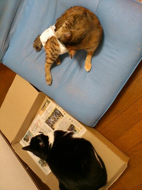 気が強いオムツ猫さんと、臆病で体のでかい先輩猫さん、