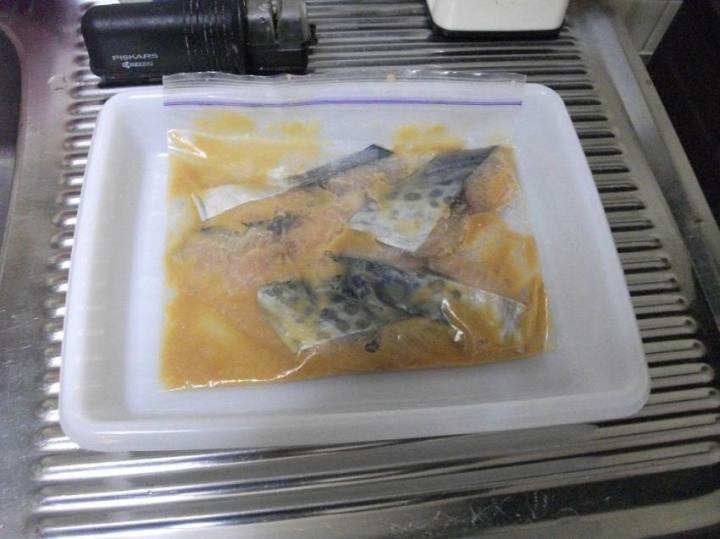 3、1のさわらの水気をよく拭き、味噌だれ半量と一緒にビニール袋に入れ、空気を抜いて10分程漬ける。(味噌だれの残りの半分は焼く時に使う。)