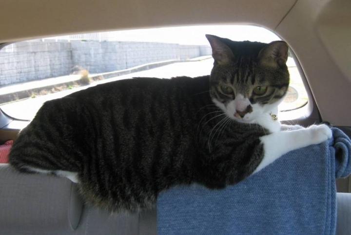 最近後ろのシートのヘッドレストの上に座るのがマイブームみたいです。