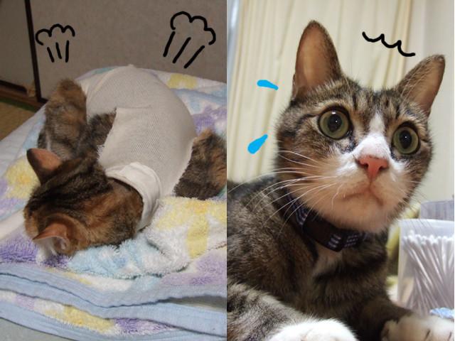 僕は笑っていいのかどうか悩みましたが噛付き防止のエリザベスカラー