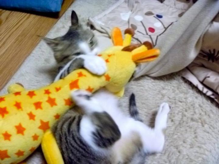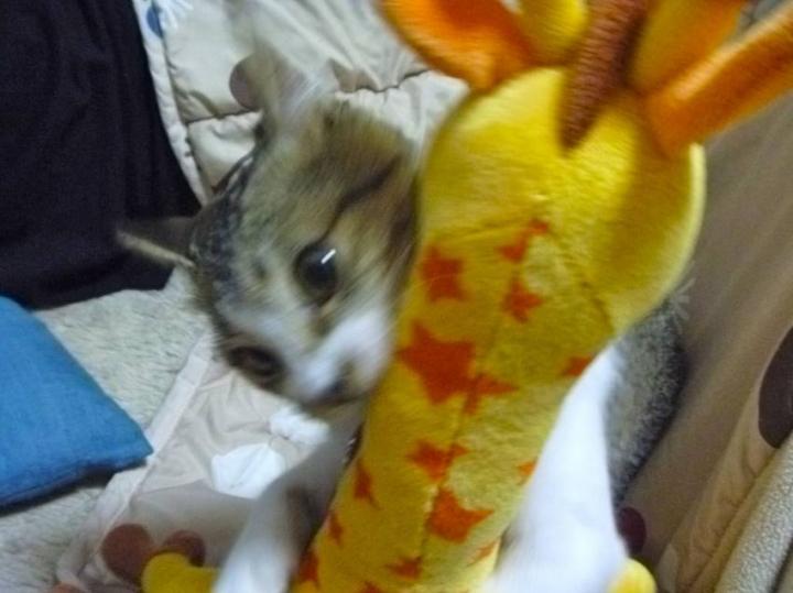 出発間際、飼い主1はそんなキリンをみかんの寝床にそっと置いてました(鬼!)。
