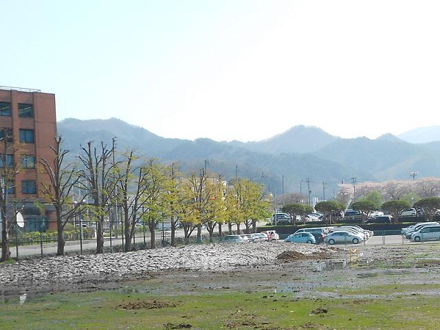 山形県庁グラウンドの雪です。桜と新緑と雪、期間限定の風景です。ここの雪がいつまで残っているのか、ちょっとした楽しみです。