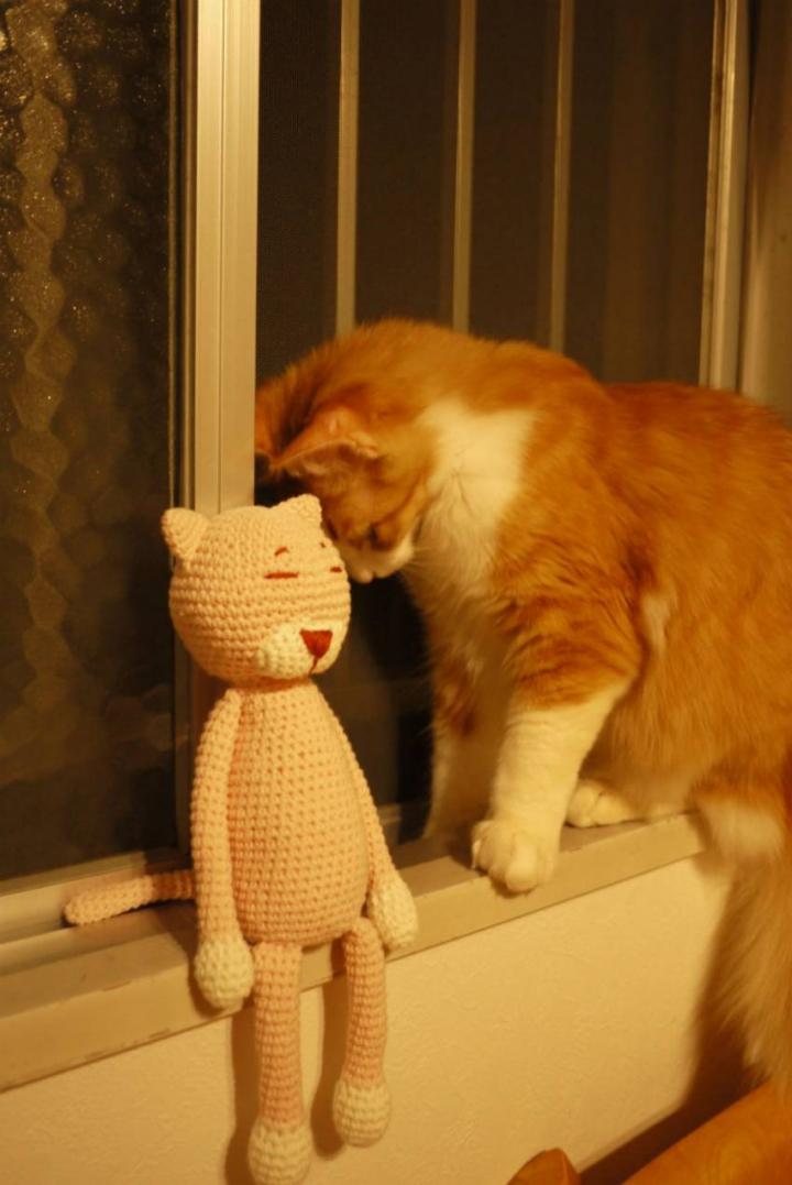 また我が家にあみねこが増えました。 (編み図は「だらだらあみねこ」で検索したらヒットします) 初めてのボブテイルの子。 毛糸が足りなくなったんです・・・。 前回のサバ男と...