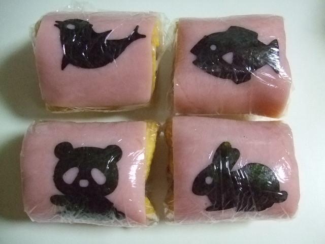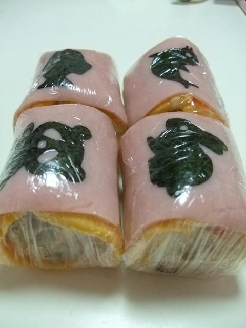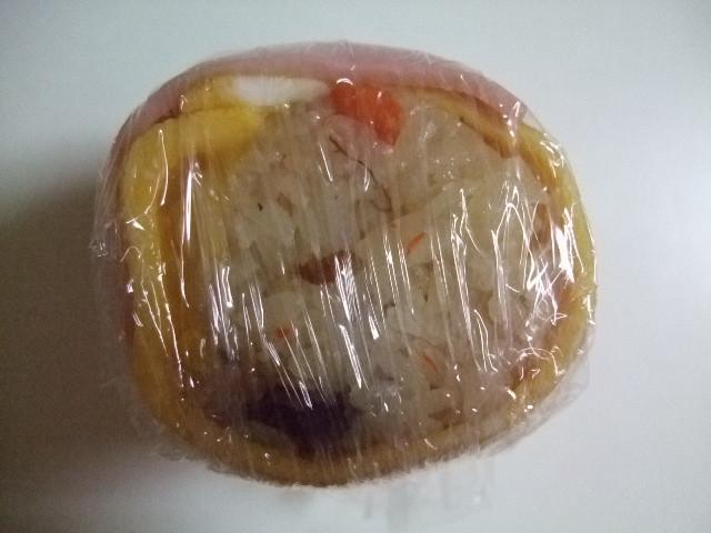今回は 炊き込みごはんを俵型ににぎり 前回よりも厚めの卵焼きを一周巻き さ・ら・にハムも巻いてみました(*^。^*)
