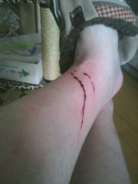 部屋に入りました。気づいたときには、アロハからすごい勢いで爪で引っかかれた足から血が流れていました。最悪状態です。