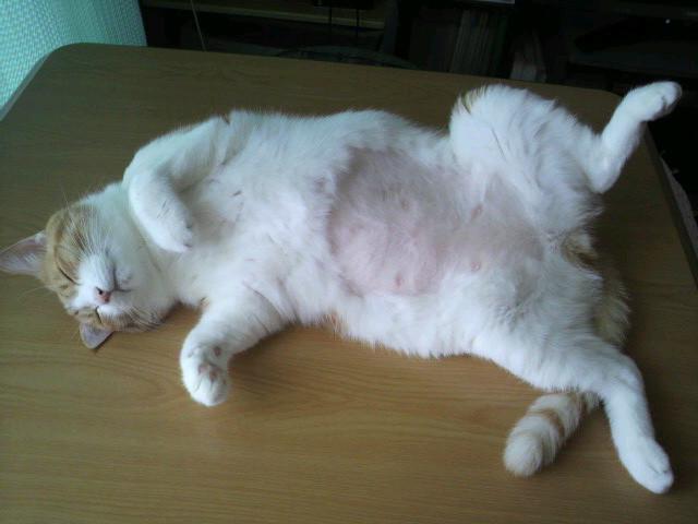 検査のためにお腹の毛を剃ってること以外はごく普通のマリちゃんの寝姿。
