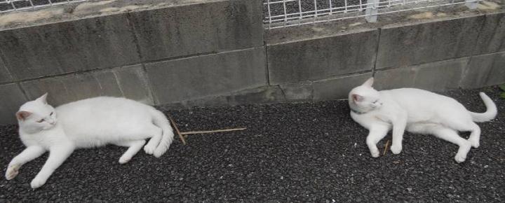 しまは、しろとは女同士の微妙な力関係があるので、3mほど離れて同じポーズとってみたり、ひとり黄昏てみたり・・・。しろの姪だけど似てないなあ。そうそう、彼女の本日の獲物はトカゲとバッタ。父の話ではでかいカエルも咥えていたらしい。食べた痕跡は無いが・・尻尾の無いトカゲとバッタの足はあったよん(~_~;)。
