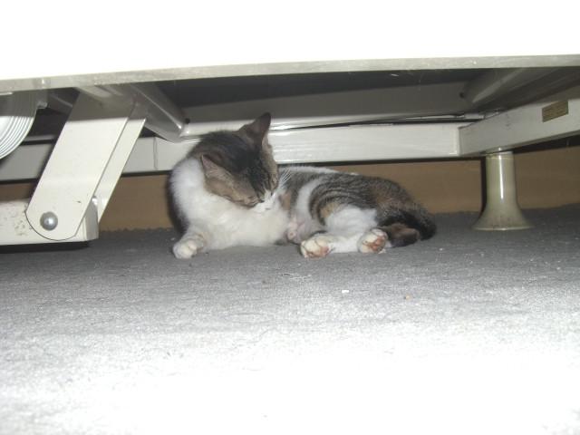 ベッドの下でグルーミング。無警戒。あるいはひょっとして無視?