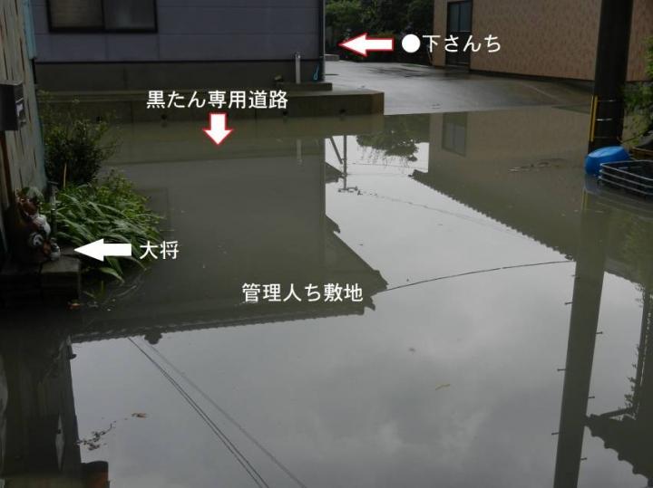 家の裏も浸かって、工事したばかりの排水溝もあふれかえっている。