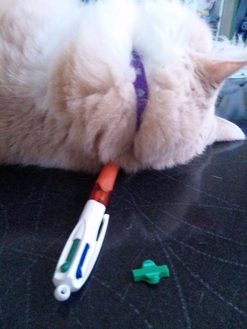 ボールペンが刺さった猫(笑)に、見えますよね。