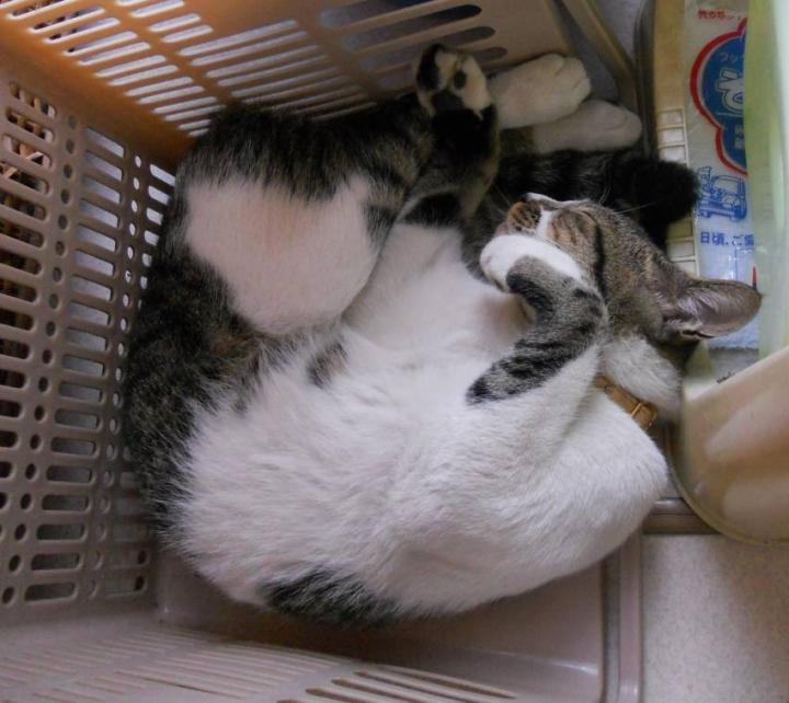 そして夕方、窓の上の方にとまったセミを捕ろうと網戸をてっぺんまで駆け上ったのに逃してしまって、ふて寝をするしま。