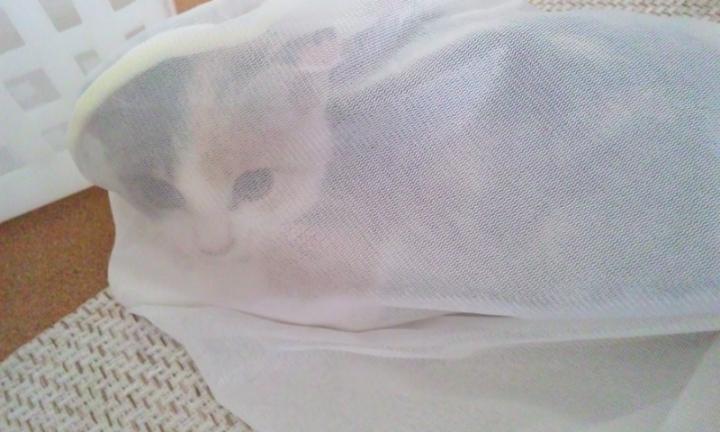 今日は洗濯ネットに目をつけた模様。中に入って遊んでます。
