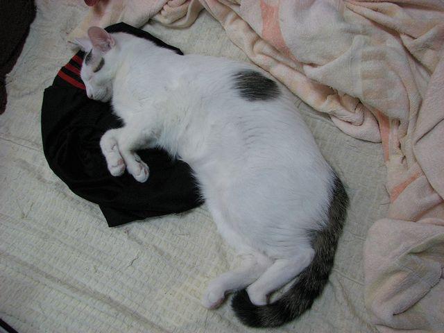 今日は、夫の布団の上で、人の洋服を枕にすやすや。