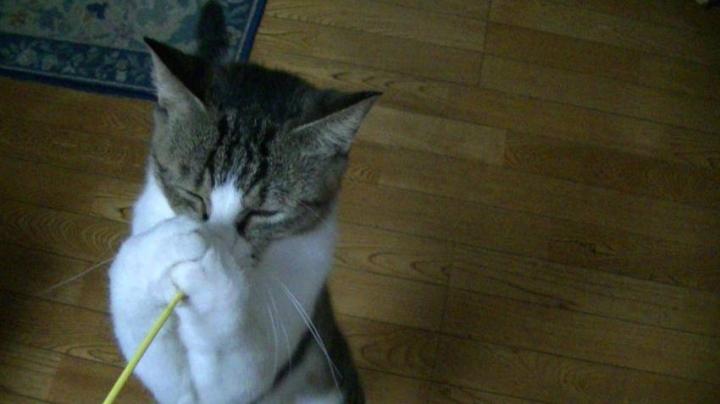 猫じゃらしをつかんでいるところがお祈りしているみたいに・・・