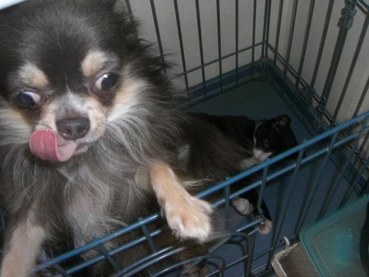 猫から好かれる一番人気はチワワのチロちゃんです。のらも暇するとチロのゲージに乱入してます。