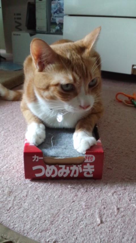 細長い爪とぎの上に箱座りしていたのを撮りました。タイミング的に箱座りにならなかったですが…。