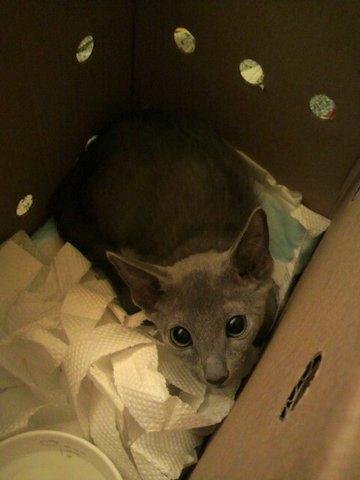 帰宅してさっそく組み立てて入れてみると、隅っこに丸まって『どうぞお構いなく…』という視線を送ってくるセイ。