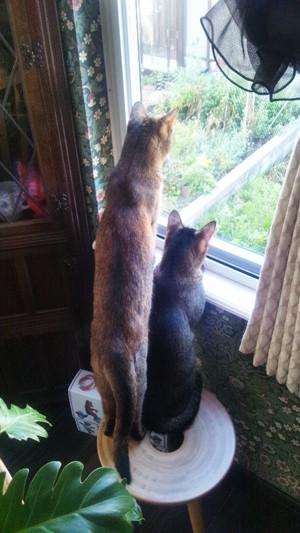 そのご婦人が早朝、家庭菜園されているのを狙う二匹。
