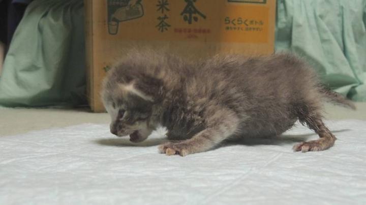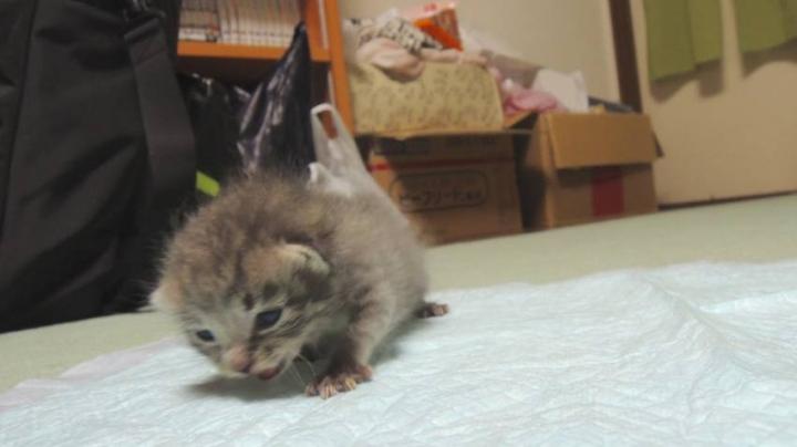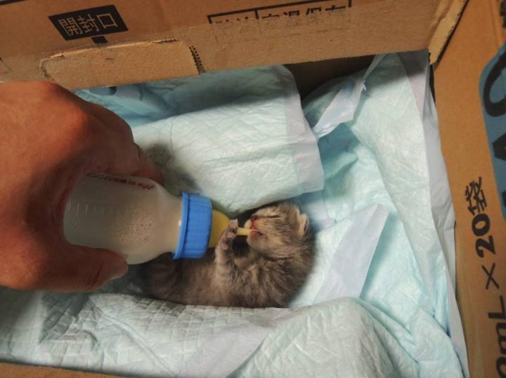夜中の3時頃にお腹をさすってやっているとゴロゴロ咽をならして前脚を宙に向かってフミフミしだしたので、おぉ、乳を求めている!と思って哺乳瓶で与えるとしっかり銜えこんで、飲もうとしている(*´▽`*)