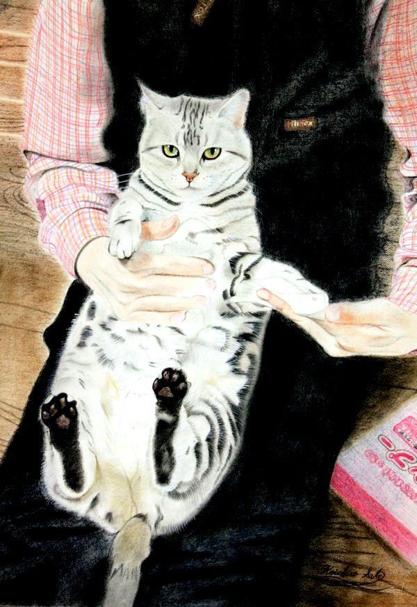 この絵は、愛猫のメイが、足を拭かれているところを描いたものです(@_@)φ
