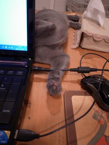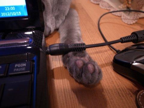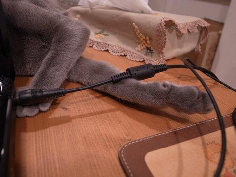 このケーブルとテーブルのすきまに手を差し込んで肉球をワシワシッっとマッサージ(?)してるんです!