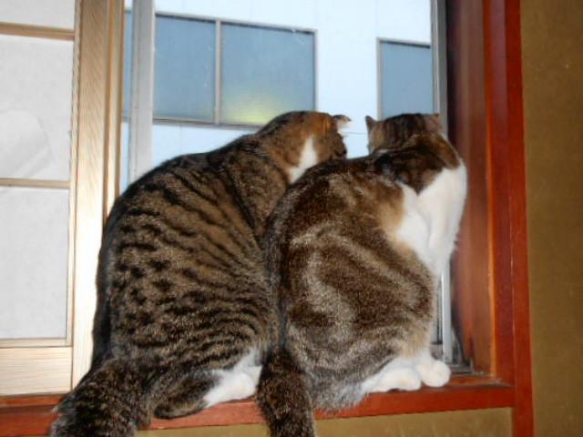 その後ろにノラちゃんのムギワラ猫のさっちゃん(仮名)が座っている。