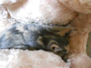 初日にはスネ毛の生えた夫の脚を疑似「母猫のお腹」としてチュパチュパやっていたみーさんですが、今ではモフモフのベッドの方が吸い甲斐があると判った模様。フミフミ&チュパチュパやっています。