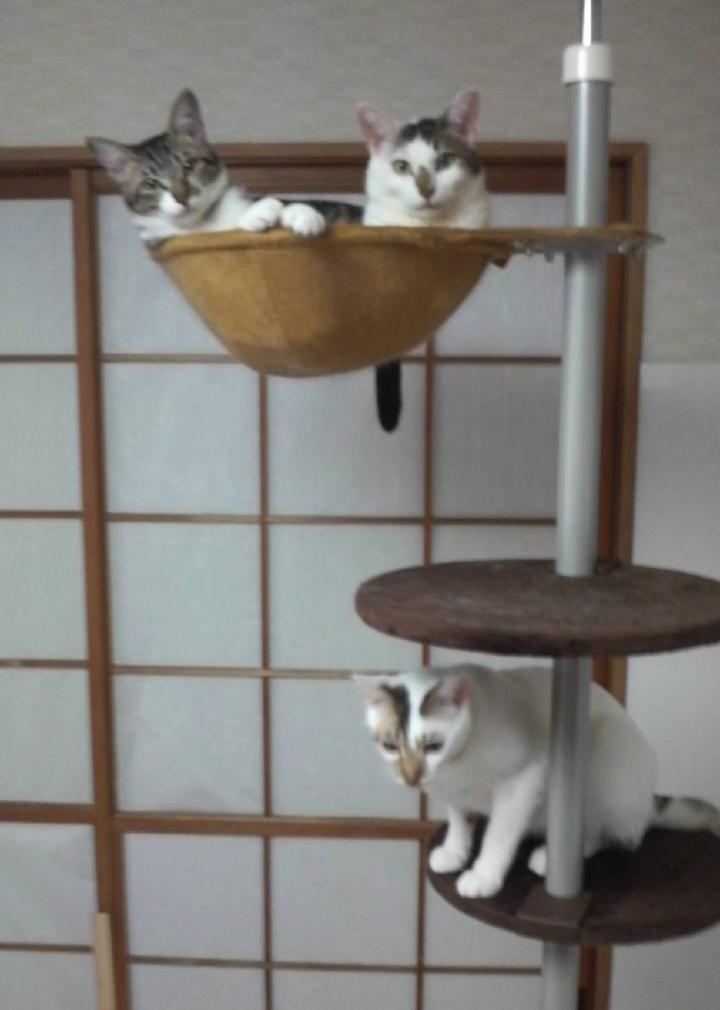 お気にいりのキャットタワーでの白オカアサン、子供のムーちゃん、ミーヤ
