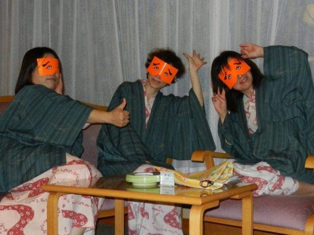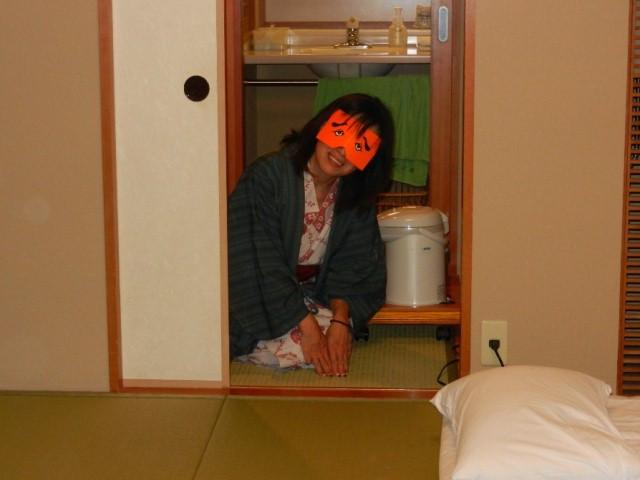 管理人が九州からもってきた「二◯加(にわか)せんぺい」のお面姿の3人。