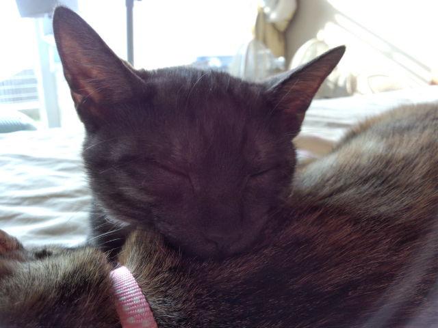 今朝は、目覚めるとチョコとミミが私の腕枕で寝ていて至福のひと時でした。
